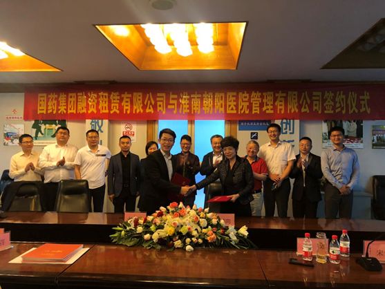 2019年5月13日,國藥租賃總裁王國梁一行前往安徽省淮南市,與淮南朝陽醫(yī)院管理有限公司簽署了戰(zhàn)略合作協(xié)議。雙方擬共同整合醫(yī)療健康產(chǎn)業(yè)鏈上下游資源,在資金、獨立醫(yī)療服務(wù)中心、信息化建設(shè)、醫(yī)院管理咨詢等方面開展全面合作。