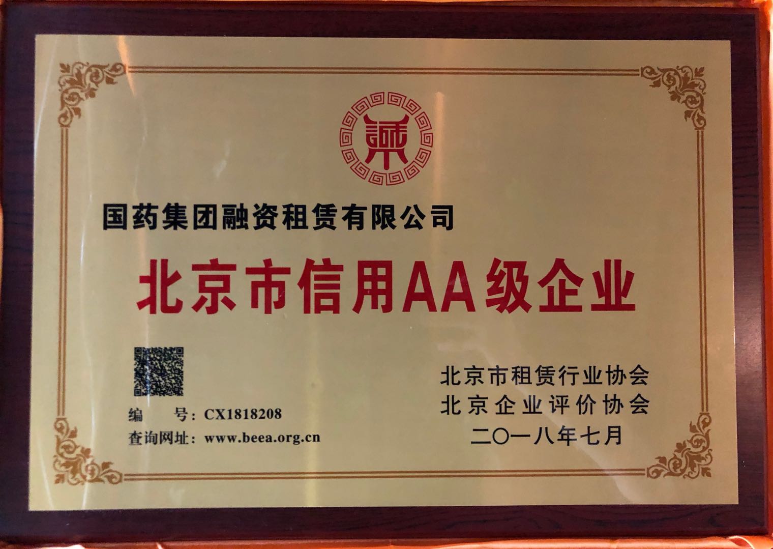 2018年7月15日,經(jīng)北京市租賃協(xié)會推薦、北京市企業(yè)信用評價活動秘書處公示,國藥集團融資租賃有限公司獲得“北京市信用AA級企業(yè)”稱號。