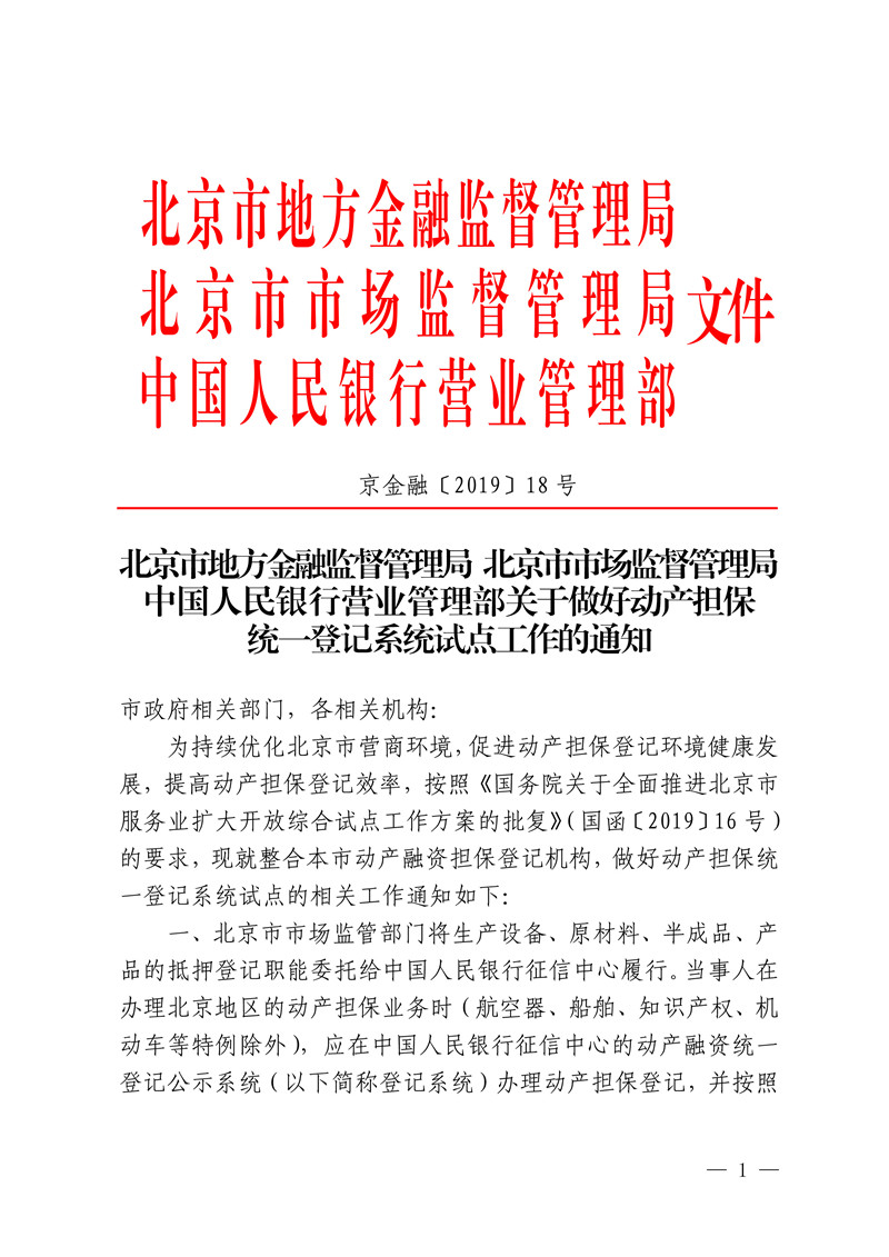 根據(jù)北京市地方金融監(jiān)督管理局、北京市市場監(jiān)督管理局、中國人民銀行營業(yè)管理部《關(guān)于做好動(dòng)產(chǎn)擔(dān)保統(tǒng)一登記系統(tǒng)試點(diǎn)工作的通知》(京金融[2019]18號),北京市決定開展動(dòng)產(chǎn)擔(dān)保統(tǒng)一登記系統(tǒng)試點(diǎn)工作。