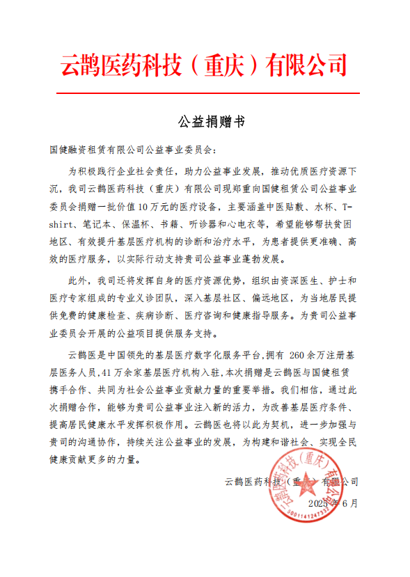 感謝云鵲醫(yī)發(fā)揮專業(yè)優(yōu)勢,為國健租賃公益事業(yè)委員會提供一批醫(yī)療物資捐贈,用行動詮釋企業(yè)社會責任;
